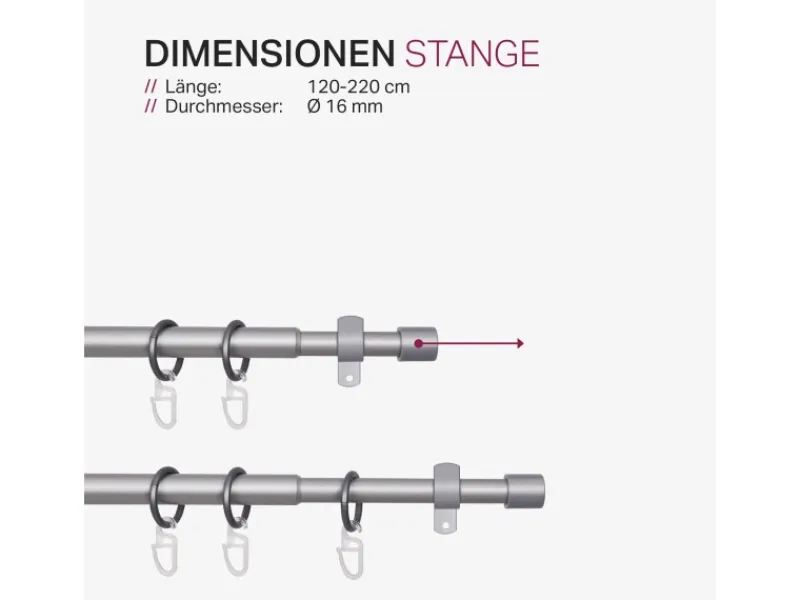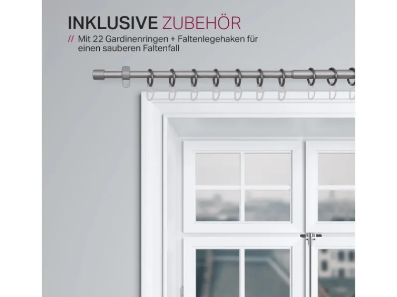 LIEFERUMFANG – 1x Stilgarnitur ausziehbar inkl. Ringe mit Faltenlegehaken, Montageanleitung und Befestigungsmaterial (22x Ringe, 22x Vorhanggleiter, 6x Schrauben, 6x Dübel, 3x Faltenlegehaken, 3x Wandträger).