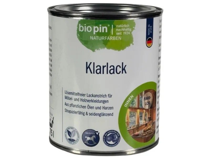 Der Biopin Klarlack ist ein seidenglänzender, lösemittelfreier Klarlack aus pflanzlichen Ölen und Harzen, der für natürliche und farblose Holzversiegelungen im Innenbereich sorgt. Er eignet sich ideal für die Lackierung von Möbeln, Holzverkleidungen, Kinderspielzeug und mehr. Auch inhaltsstoffreiche Hölzer wie Eiche, Kastanie oder Merbau können damit problemlos behandelt werden.