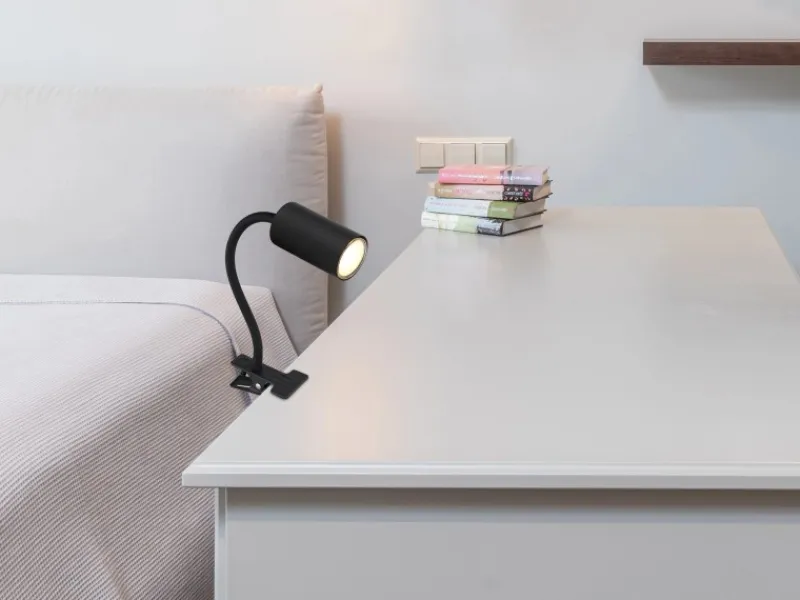 Der kleine klassische Klemmstrahler Robby ist hergestellt aus schwarzem Kunststoff und schwarz mattem Metall. Er verfügt über einen Schalter, welcher das Ein- und Ausschalten der Lampe ermöglicht und ist zudem auch beweglich (flexo). Die GU10 Fassung überlässt Ihnen die Wahl des Leuchtmittels (max.25W) und somit auch die Lichtstärke und Lichtfarbe. Aufgrund ihrer Langlebigkeit und Stromersparnis empfehlen wir LED-Lampen.