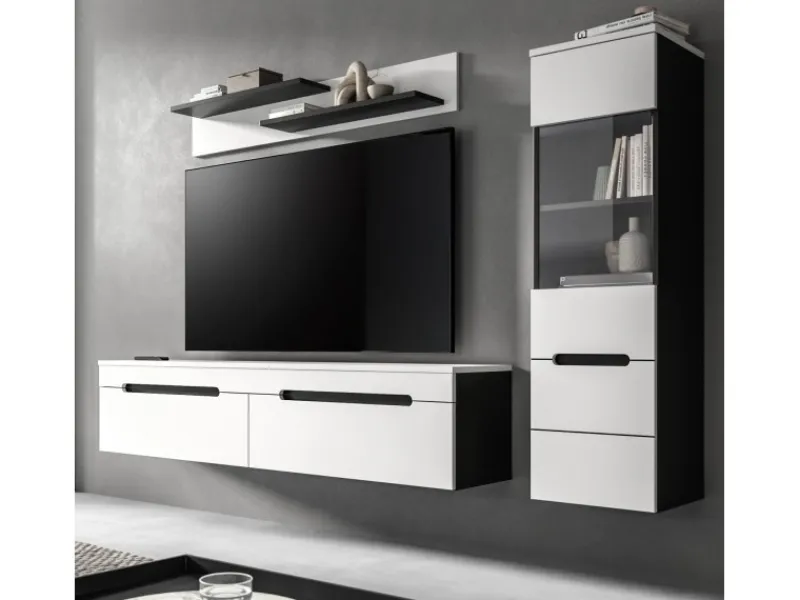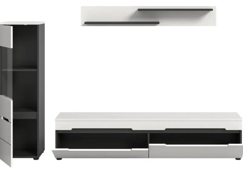 Erleben Sie mit der 3-teiligen Wohnwand „Cooper“ eine stilvolle Lösung, die Ihrem Wohnraum nicht nur Ordnung verleiht, sondern auch für ein harmonisches Ambiente sorgt. Die Kombination aus weißer Front und Oberboden mit basaltgrauem Korpus plus Absetzungen schafft eine zeitgemäße Optik. Die grifflosen Fronten unterstreichen das klare Design und verleihen Ihrer Einrichtung eine besondere Leichtigkeit, wobei Sie die Wohnkombination ganz oder teilweise stehend als auch hängend platzieren können. „Cooper“ besteht aus drei Teilen: einer Vitrine, einem Wandboard und einem TV-Lowboard. Mit insgesamt zwei Vitrinenfächern, drei geschlossenen Fächern sowie zwei Regalböden bietet die Wohnwand vielfältigen Stauraum für Ihre Lieblingsstücke, Mediengeräte und Dekorationen. Die kompakten Maße von 221 x 141 x 33 cm passen ideal in unterschiedlichste Raumgrößen.