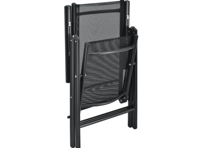 Acht 52 x 65 x 110 cm große Stühle mit Aluminium Rahmen sind trotz ihrer Leichtigkeit ungemein stabil und standfest. Für den größtmöglichen Sitzkomfort stellen Sie die Lehne Ihres Stuhls zurück. Die Stühle lassen sich platzsparend zusammenklappen.
