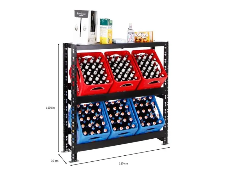 Das Getränkekistenregal Tegernsee XL von PROREGAL® ist ideal um im Aufenthaltsraum in der Garage oder in der Kantine die Getränkekisten aufzubewahren.Die Produktion des Regals erfolgt nach höchsten Qualitätsstandards in der EU. Die Fertigung ist nach ISO 9001 zertifiziert. Das Metall ist pulverbeschichtet um eine lange Lebensdauer sicherzustellen und entgratet um unangenehme Schnittkanten zu beseitigen.Selbstverständlich sind die Fachböden in der Höhe verstellbar und zwar in einem 38 cm Raster. Durch die flexible Einstellungen lassen sich auch andere Kisten abseits von Getränkekisten sehr praktisch lagern. Die Doppel-Profile erhöhen die Standstabilität und die Metallfüße können sogar auch praktisch mit dem Boden verschraubt werden.