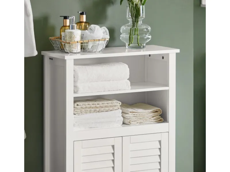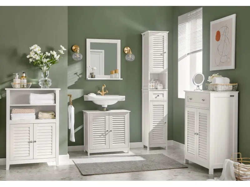 Vielseitiger Badschrank mit weiß lackierter Oberfläche – passt perfekt zu modernen Badezimmermöbeln, ideal als Schuhschrank, Sideboard oder Aufbewahrungslösung im Flur.