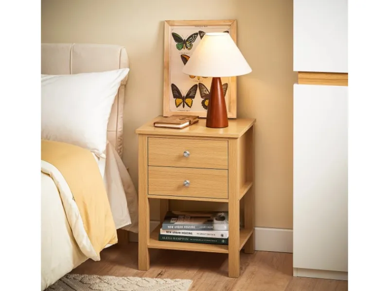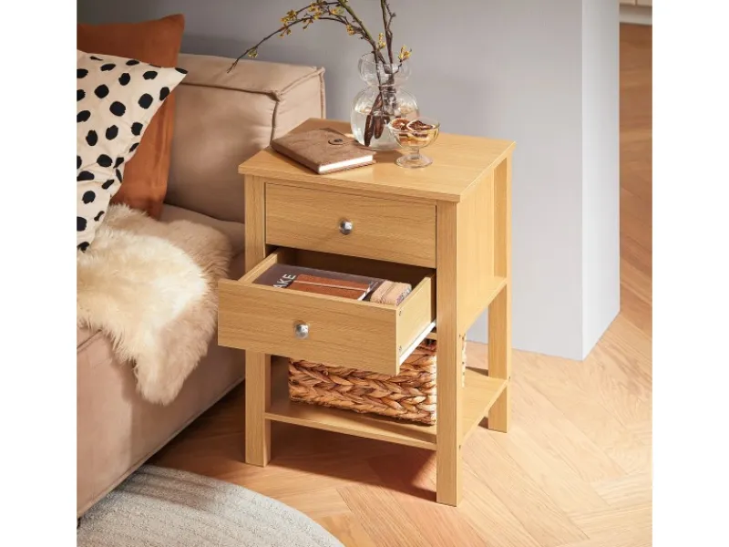 Nachttisch mit offenem Fach und zwei Schubladen mit Griffen bietet bequemen und diskreten Stauraum.