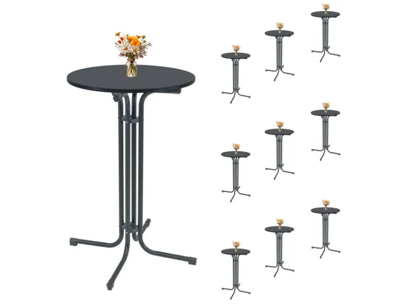 Produktinformationen je Tisch: Maße (HxB) ca. 110 x 70 cm Durchmesser Tischplatte ca. 70 cm Tischhöhe ca. 110 cm Material Gestell Pulverbeschichteter Stahl Material Tischplatte MDF-Holz Tischplattenstärke ca. 2 cm Traglast ca. 50 kg Tischfarbe Anthrazit Farbe Tischplattenunterseite Anthrazit Gewicht ca. 9 kg Artikelnummer 8951903 Lieferumfang: 10x TRUTZHOLM Stehtisch klappbar in Anthrazit Ø 70 cm, originalverpackt