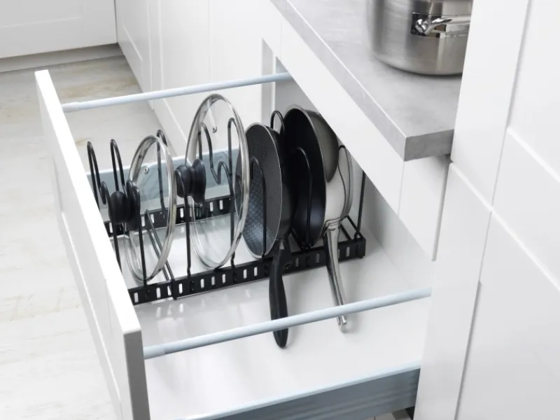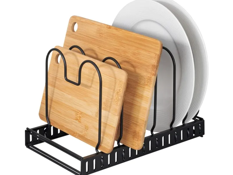 Ordnung macht Laune! Der moderne Geschirrständer ermöglicht eine platzsparende und übersichtliche Aufbewahrung von Pfannen, Deckeln, Backformen, Geschirr, Auflaufformen, Schneidebrettern, etc. in unterschiedlichen Größen.