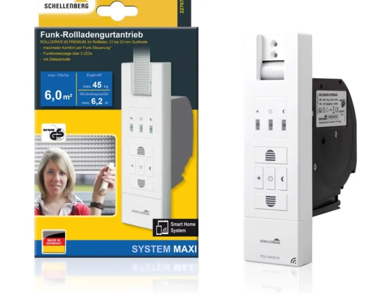 Der Schellenberg RolloDrive 65 Premium ermöglicht die Bedienung eines Rollladens bequem per Knopfdruck, Zeitautomatik, Funk oder Smart-Home-App. Der elektrische Gurtwickler ist für Rollläden bis zu einer Anfangszuglast von 45 kg und einer Gurtbreite von 23 mm geeignet. Er ersetzt einen vorhandenen mechanischen Einlasswickler vollständig und hat zwei Lochabstände von 165 mm bzw. 185 mm. Er ist ideal für Mietobjekte geeignet, da für den Einbau das Öffnen des Rollladenkastens nicht notwendig ist.