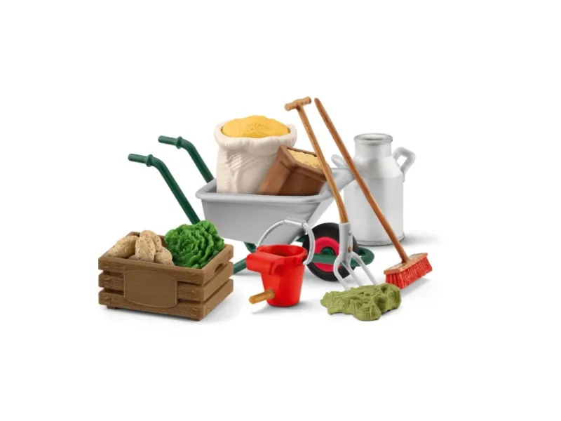 Das Schleich Stallpflege-Set mit Zubehör bietet alles, was man für die Versorgung der Bauernhoftiere benötigt. Das Pferd erhält leckeren Hafer, während sich die Schweine über frische Kartoffeln und Salat freuen. Das Kälbchen bekommt Milch aus seinem Eimer mit Trinkvorrichtung. Das Heu für die Kühe wird mit der Heugabel aufgespießt und mit der Schubkarre zu den Tieren gebracht.