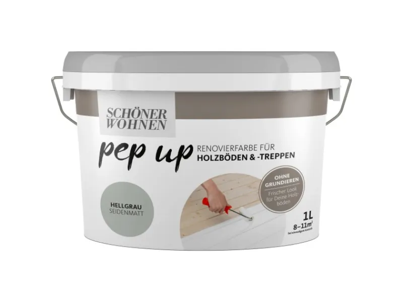 Mit den trendbewussten Schöner Wohnen pep up Renovierfarben für den Innenbereich entsteht schnell und einfach ein frischer Look für die eigenen vier Wände. Die Renovierfarbe für Holzböden und -treppen ist wasserbasiert, widerstandsfähig sowie schnell trocknend und eignet sich für die strukturerhaltende Gestaltung von Parkettfußböden, Dielen und Holztreppen.