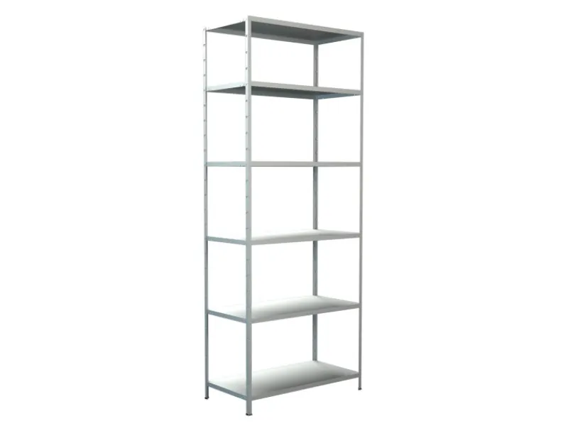 Vorhandene Verstellraster sorgen für ein beliebiges und einfaches Einstecken der Fachböden in die gewünschte Ebene. Das Regal ist modular erweiterbar mittels eines zusätzlichen Anbauregals.