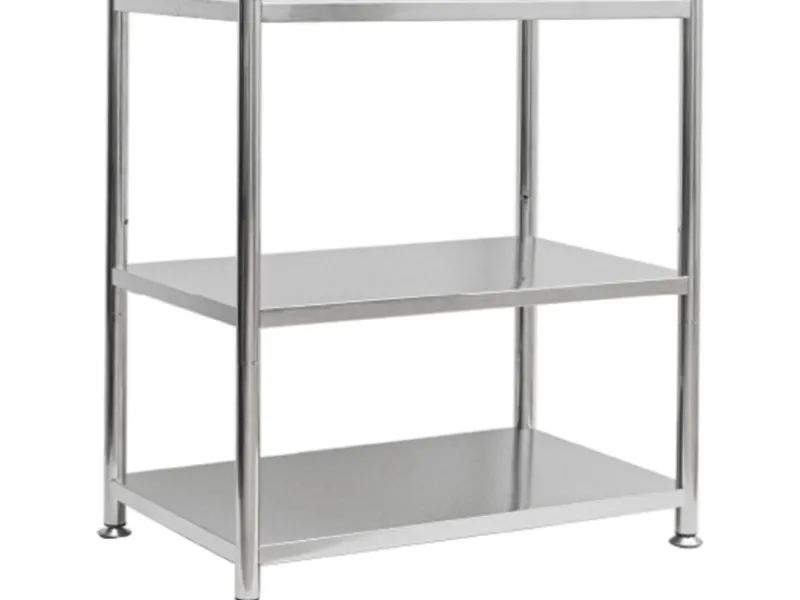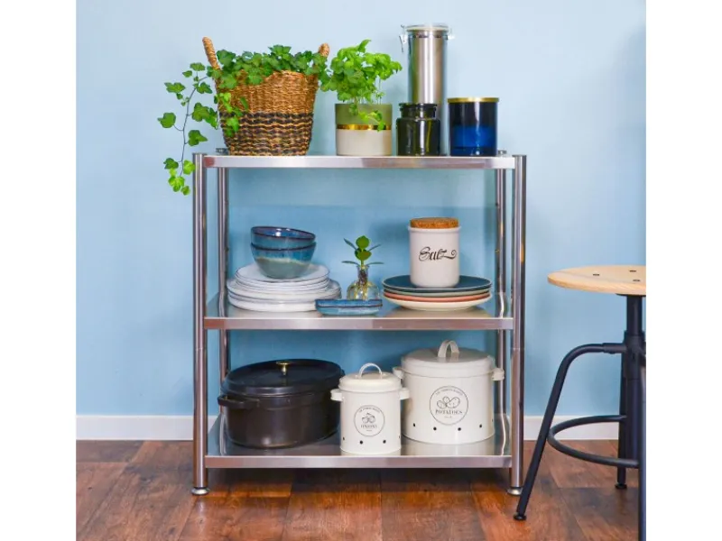 Das hochwertige Edelstahlregal mit seinen großen Ablagen schafft jede Menge extra Stauraum.