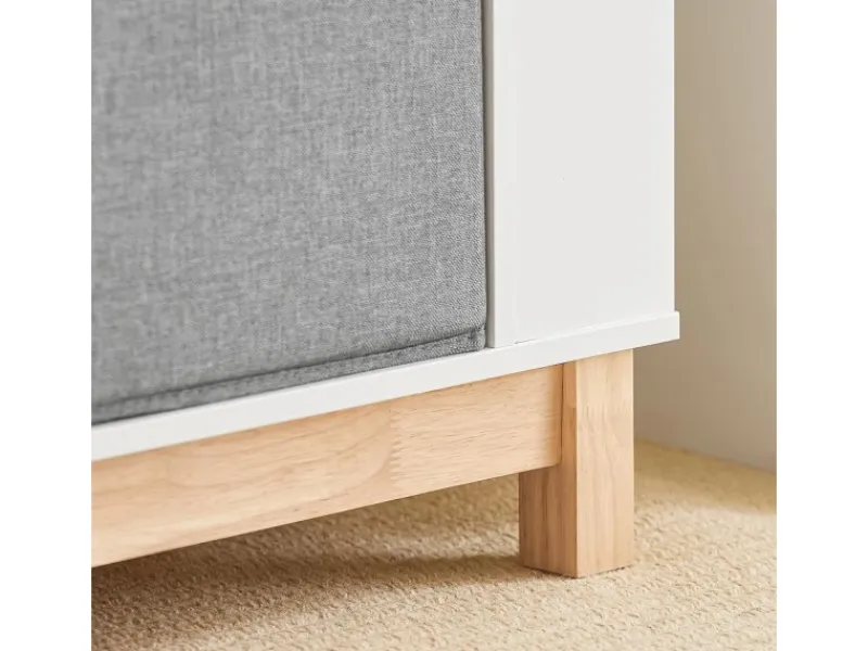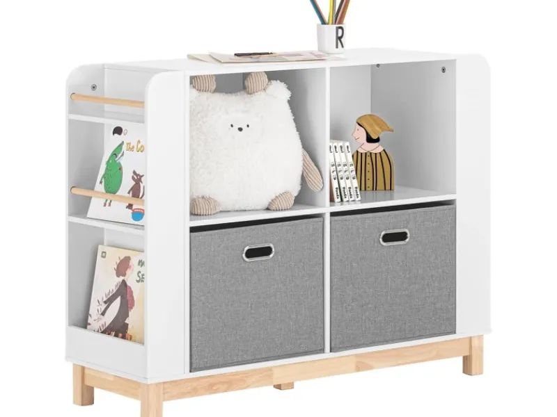 4 Fächer, 2 Stoffboxen für eine Vielzahl von Spielzeug und 6 Ablagen (3 auf jeder Seite) für Bücher.