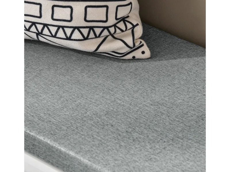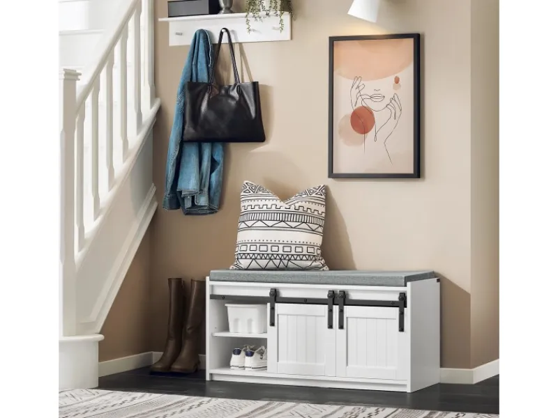 Diese Schuhbank ist mit einem Sitzkissen ausgestattet, um sich im Sitzen die Schuhe an- oder auszuziehen.