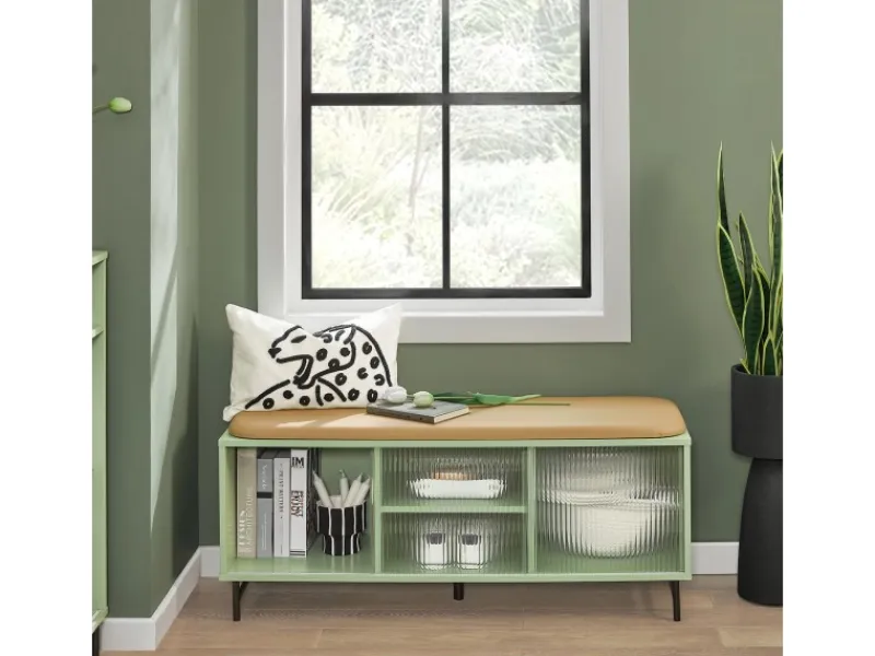 Diese Schuhbank ist mit einem weichen gelben Sitzpolster aus PU-Leder ausgestattet, um sich im Sitzen die Schuhe an- oder auszuziehen.