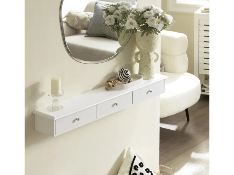 Das Regalbord mit 3 Schubladen kann als Wandregal oder -schublade verwendet werden.