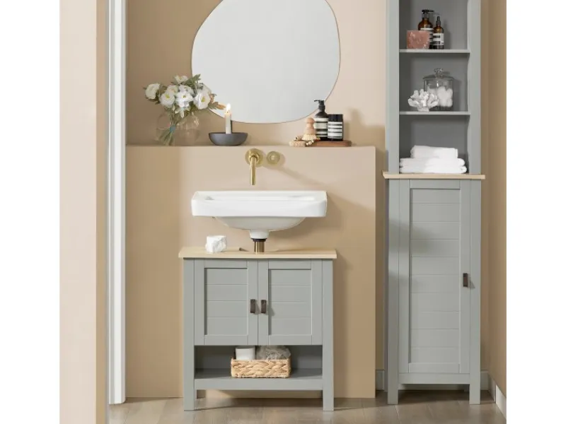 Der Waschbeckenunterschrank mit Ablagen bietet ausreichend Platz für Badutensilien.