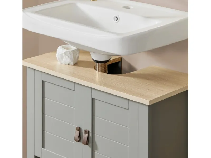Feuchtigkeitsbeständiges Material: Der Waschbeckenunterschrank aus MDF ist resistent gegen die hohe Luftfeuchtigkeit im Badezimmer und bietet langlebige Nutzung und Stabilität.
