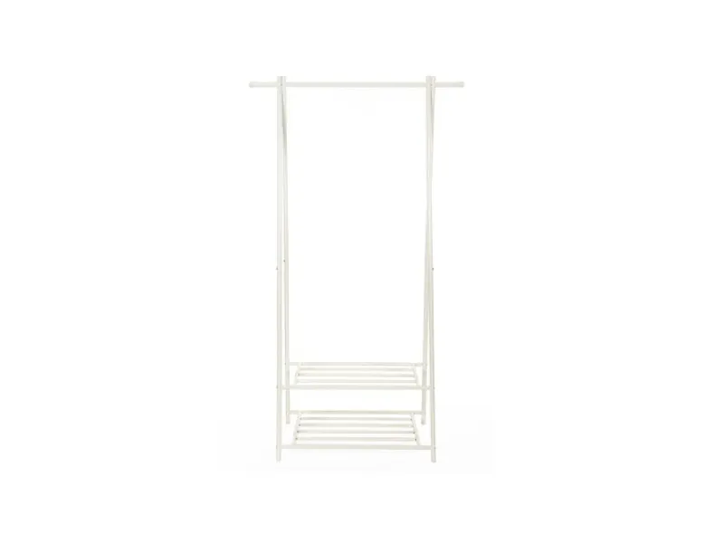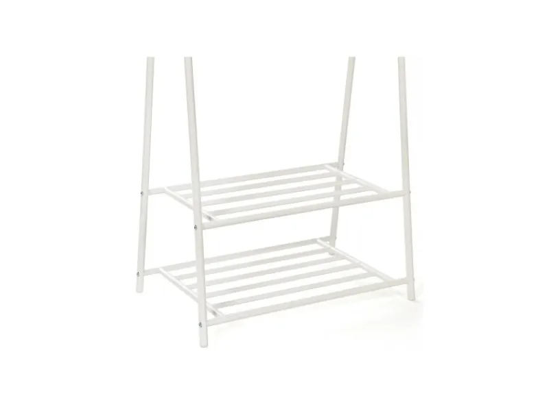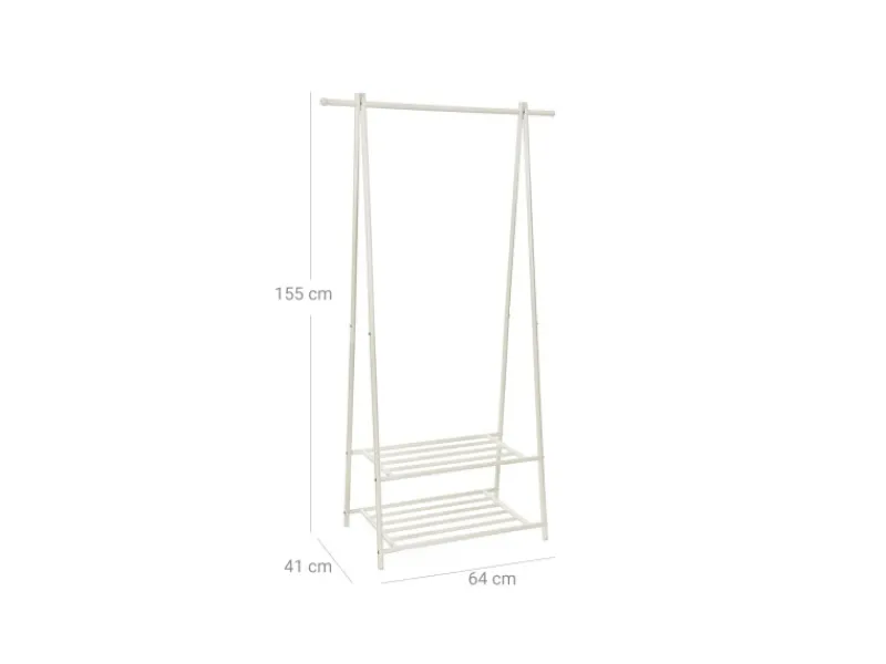 Leicht nach oben verjüngt, die A-förmige Eisenstruktur, die durch zwei Regale an der Unterseite verstärkt wird, bietet erhebliche Stabilität und verleiht Ihrem Zuhause einen Hauch von Einfachheit. Die Tragfähigkeit der Stange beträgt 20 kg. Sie können Ihre Kleidung, Hüte und Krawatten aufhängen, um Ihren Platz zu maximieren. Jedes der beiden Regale kann 25 kg tragen, sodass Sie Ihre Schuhe und viele andere Accessoires darin aufbewahren können.