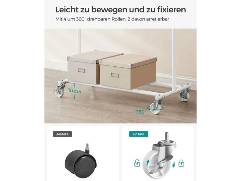 Dieser Kleiderständer wird mit 4 um 360° drehbaren Rollen geliefert, von denen 2 feststellbar sind, sodass Sie sie mit Leichtigkeit von Ihrem Schlafzimmer in Ihre Garderobe bewegen und bei Bedarf arretieren können. Es werden keine Werkzeuge benötigt, um diesen Kleiderständer aufzubauen, und sie kann in nur 3 Schritten fertig sein. Bei Nichtgebrauch können Sie es zerlegen und platzsparend unter Ihrem Bett oder in eine ungenutzte Ecke legen.