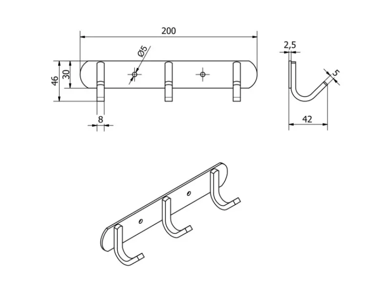 Abmessungen – Gesamtlänge 300 mm / Höhe 25 mm / Tiefe 38 mm / Haken-Ø 12 mm