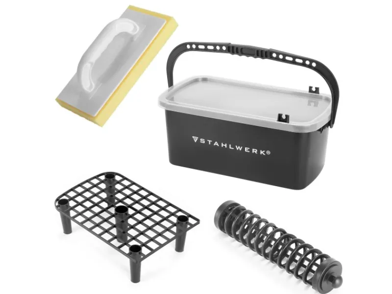 – Das professionelle STAHLWERK Fliesen Waschset besteht aus einem rollbaren 12 Liter Kunststoffeimer, einem perforierten Rollenaufsatz, einem Waschbrett mit Schwammauflage sowie einem Abtropfgitter mit Standfüßen.