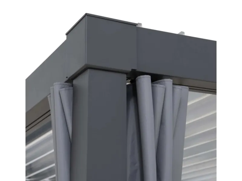 Die Vorhänge lassen sich mit der mitgelieferten Montagehardware mühelos an den doppelten Vorhang- bzw. Netzschienen befestigen, die Bestandteil ausgewählter Pergolen sind.