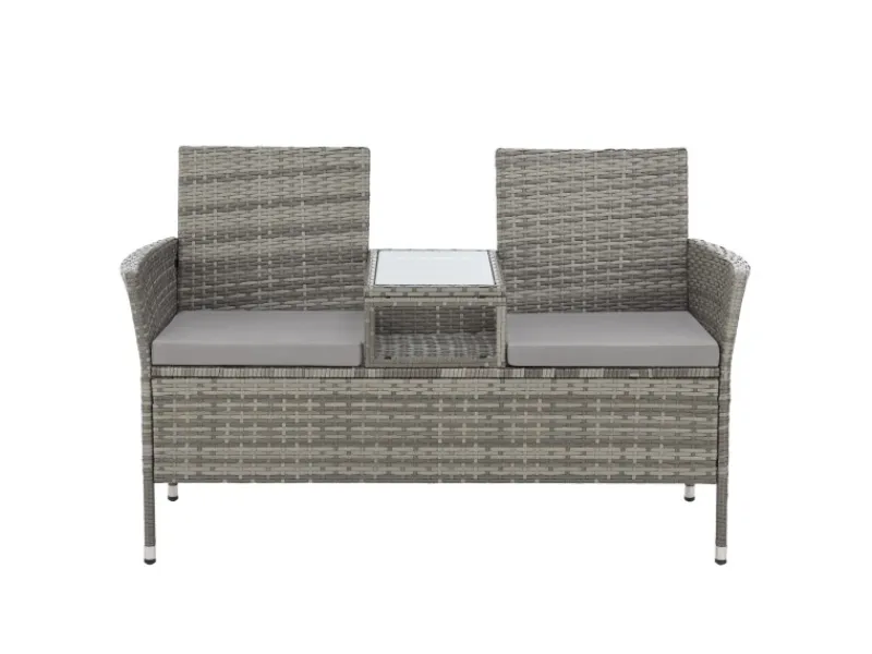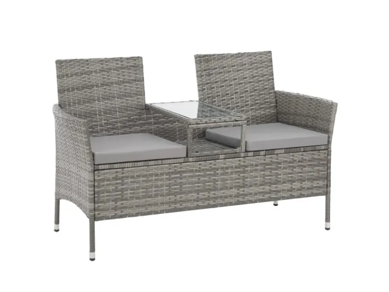 Ob Wohnraum, Wintergarten oder Outdoor; diese wetterfeste Poly-Rattan Bank macht alles mit! Mit dieser pflegeleichten Gartenbank können Sie viele Stunden gemütlich im Garten, auf der Terrasse oder dem Balkon verbringen. Die weich gepolsterte Sitzfläche (5cm Kissen) und der mittige Kaffee-Tisch erhöhen hierbei den Komfort, denn dank der Tischfläche lassen sich auch Speisen und Getränke einfach abstellen. Die Tischplatte besteht aus gehärtetem Glas mit einer Stärke von 5mm.Für den idealen Stand verfügt die Rattanbank über verstellbare Metallfüße, welche auch kleine Unebenheiten ausgleichen können. Die Polsterbezüge können ganz einfach abgenommen und gewaschen werden.