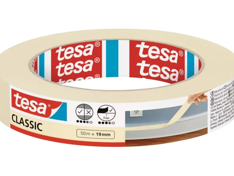 Das Tesa Malerband Classic schützt vor Farbspritzern und ermöglicht saubere Farbkanten auf glatten und leicht unebenen Oberflächen im Innenbereich.