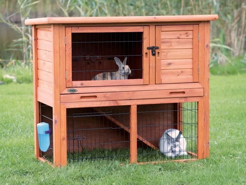 Hüttenzauber bei Trixie: Ställe für Kaninchen und andere Kleintiere sowie nützliches Zubehör finden Sie hier. Der Kleintierstall Natura ist aus lasiertem Kiefernholz gefertigt und mit stabilen, pulverbeschichteten Metallgittern ausgestattet. Das Dach besteht aus besandeter Dachpappe und ist von oben zu öffnen. Die Holzrückwand im Freilaufgehege schützt Ihre geliebten Kleinen vor starkem Wind. Der zweistöckige Kleintierstall bietet verschiedene Rückzugsmöglichkeiten und ist durch die herausziehbare Kunststoffwanne leicht zu reinigen. Die Bodenluke ist mit einer Kunststoffbeschichtung versehen und verschließbar. Der Trixie Kleintierstall Natura ist durch das Freilaufgehege Natura erweiterbar.