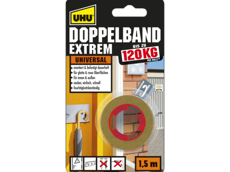 Das Uhu Doppelband extrem 1,5 m, ist ein extrem starkes, hochbelastbares doppelseitiges Klebeband zum dauerhaften Montieren und Befestigen im Innen- und Außenbereich. Das Hochleistungs-Montageband für einen universellen Einsatz. Hält dauerhaft und sicher auf fast allen glatten und leicht rauen Oberflächen, wie z.B. auf Metall, Fliesen, Kacheln, Kunststoffen, Glas, Holz, Putz, Stein und Beton. Ideal zur Montage von Schildern, Hausnummern, Halterungen, Haken, Ablageelementen, Kabelkanälen, Zier- und Sockelleisten, Dekorationsobjekten uvm. Voll belastbar nach 60 Minuten. Feuchtigkeitsbeständig.