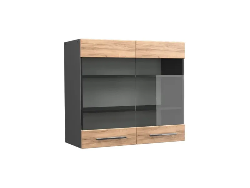 Die Hängevitrine hat Breite 80 cm, Höhe 72 cm und Tiefe 34,1 cm