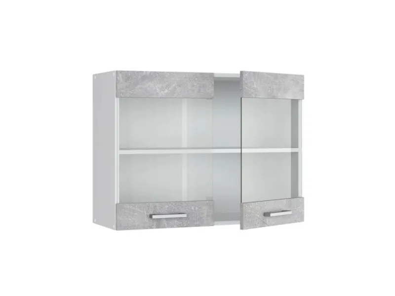 Die Hängevitrine hat Breite 80 cm, Höhe 60 cm und Tiefe 31 cm