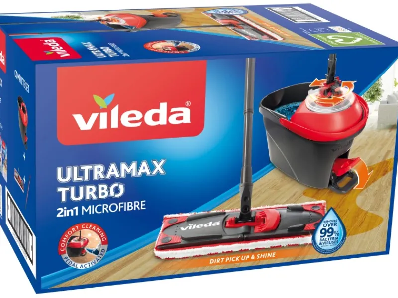 Das Vileda Bodenwischer-Set EasyWring UltraMax Turbo besteht aus dem UltraMax Bodenwischer und einem Eimer mit PowerSchleuder. Die PowerSchleuder hat ein Fußpedal für ein bequemes Auswringen ohne Kraftaufwand. Dies ermöglicht eine Reinigung ohne schmutzige Hände, ohne Bücken und ohne großen Aufwand! Der Schmutz und das Wasser werden einfach in den Eimer geschleudert. Sie können die optimale Feuchte individuell nach dem Bodenbelag bestimmen. Das Set ist mit UltraMax Bezügen kompatibel. Mit Hilfe der Powerzone können selbst hartnäckigster Schmutz und Flecken entfernt werden. Dank des flexiblen Gelenkes reinigt der UltraMax mühelos auch in Ecken und unter Möbelstücken. 3-teiliger Stiel mit 130 cm Länge, Fassungsvermögen Eimer: 5 l.