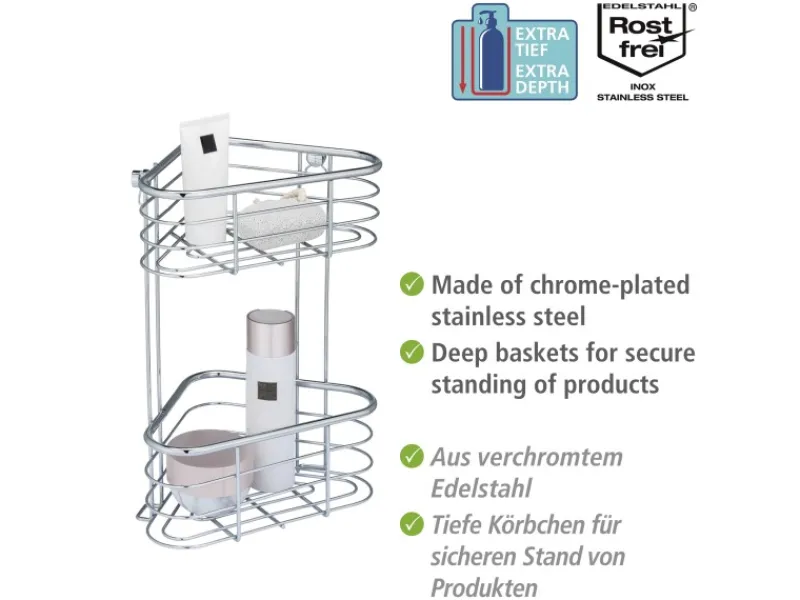 Optisch und praktisch eignet sich das hochwertige Eckregal Trestina ideal für den Einsatz im Badezimmer. Pflegeprodukte in Flaschen oder Tuben können hier aufgeräumt und elegant aufbewahrt werden. In zwei Körbchen lassen sich Ihre Produkte hervorragend sortieren – ob nach Besitzerin oder Besitzer oder nach Produktkategorie. Vor allem im Duschbereich finden Shampoos oder Duschgele einen geeigneten Platz auf der gewünschten Höhe.