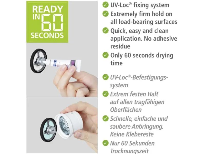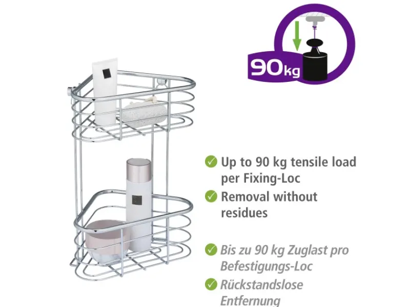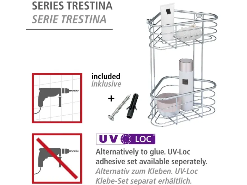 Alternativ kann das Eckregal Trestina mit 2 Etagen auch ohne Bohren befestigt werden – das gelingt Ihnen in Minutenschnelle mit dem innovativen UV-Loc® Klebesystem von WENKO. Mittels Spezialkleber und UV-Lampe bekommen Sie das Bad-Accessoire in nur 60 Sekunden an die Wand. Das UV-Loc®-Befestigungsset ist separat erhältlich.