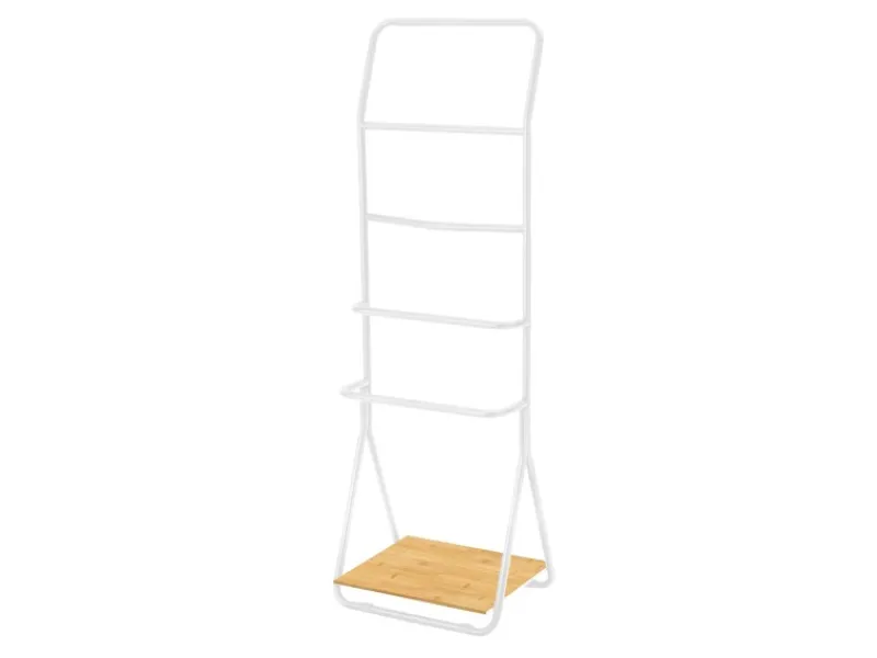 Der praktische Handtuchhalter Verona bietet auf seinen 4 Handtuchstangen viel Platz für Handtücher, Kleidung oder andere Utensilien im Badezimmer. Er ist aus lackiertem Stahl gefertigt, hat 4 rutschfeste Füße und ist ebenfalls als Kleiderständer in Schlafzimmer, Wohnzimmer oder Diele einsetzbar. Eine zusätzliche Ablage aus Bambus bietet eine weitere Fläche für gefaltete Handtücher, Hausschuhe oder andere Utensilien. Das Material Bambus ist nicht nur strapazierfähig und langlebig, sondern bietet auch im Hinblick auf die Umwelt Klare Vorteile, denn es ist ein schnell nachwachsender Rohstoff.Die Form des Handtuchhalters ist so konzipiert, dass sie ganz einfach und platzsparend vor den Handtuchheizkörper im Badezimmer gestellt werden kann, damit nasse Handtücher schnell trocknen. Die Trendige Optik im Scandi-Style passt ideal in die moderne Einrichtung.
