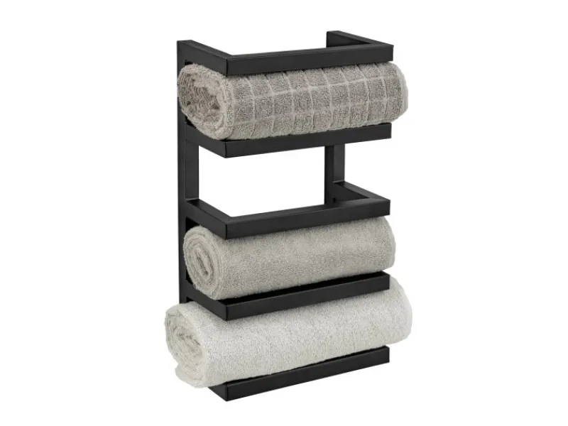 Hergestellt ist der moderne Handtuchhalter Fondiro aus lackiertem Stahl. Die schwarz-matte Oberfläche wirkt besonders elegant und hinterlässt einen bleibenden Eindruck. Der Halter ist für vier Hand- oder Badetücher geeignet – diese werden einfach zusammengerollt und übereinander in die offenen Fächer geklemmt. Dadurch können je nach Anordnung kreative Farbmuster entstehen, die dem Badezimmer einen zusätzlichen Hingucker verleihen.