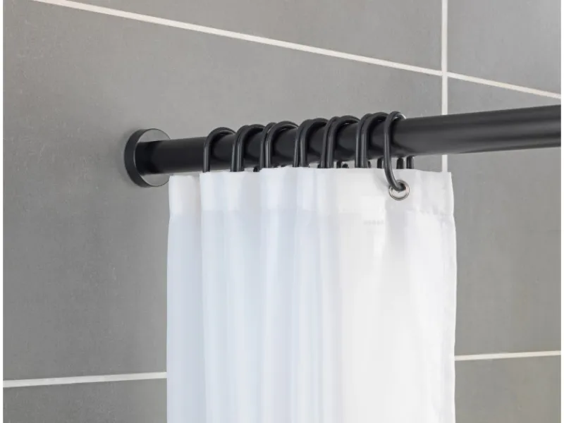 Schnelles und einfaches Anbringen des Dusch- oder Badewannenvorhangs – die Wenko Teleskop-Duschvorhangstange Luz ist ausziehbar, rostfrei und löst flexibel das Problem von fehlenden Aufhängemöglichkeiten für Vorhänge insbesondere im Badezimmer. Die Aufhangstange im attraktiven Schwarz aus rostfreiem Aluminium ist variabel von 70 cm bis 115 cm Breite einstellbar und einfach zwischen zwei Wände zu klemmen. Die im Lieferumfang enthaltenen, großen und puristisch gestalteten Wandadapter aus robustem Kunststoff geben der Duschstange für Vorhänge den notwendigen Halt. Der Rohrdurchmesser von 2,8 cm hält den Vorhang sicher und zuverlässig bereit, um herausspritzendes Wasser aus Dusche oder Badewanne abzufangen. In weiteren Wohnräumen lässt sich die klemmbare Stange ebenfalls sinnvoll einsetzen. Beispielsweise in einer Nische an der Garderobe bleiben durch das Anbringen eines Vorhangs Schuhe und Taschen verborgen. Aber auch als Raumabtrennung und im Kleiderschrank ist die Vorhangstange eine absoluter Versteck-Künstler. Auf diese Weise sorgt sie für Ordnung im gesamten Haushalt. Die Teleskop-Duschstange von Wenko ist in weiteren Farben und Maßen erhältlich. Die ideale Ergänzung für Dusche und Badewanne bilden die Duschvorhänge von Wenko, die in vielen Farben und Motiven erhältlich sind. Ideal als Komplettausstattung für jedes Badezimmer oder Gäste-WC